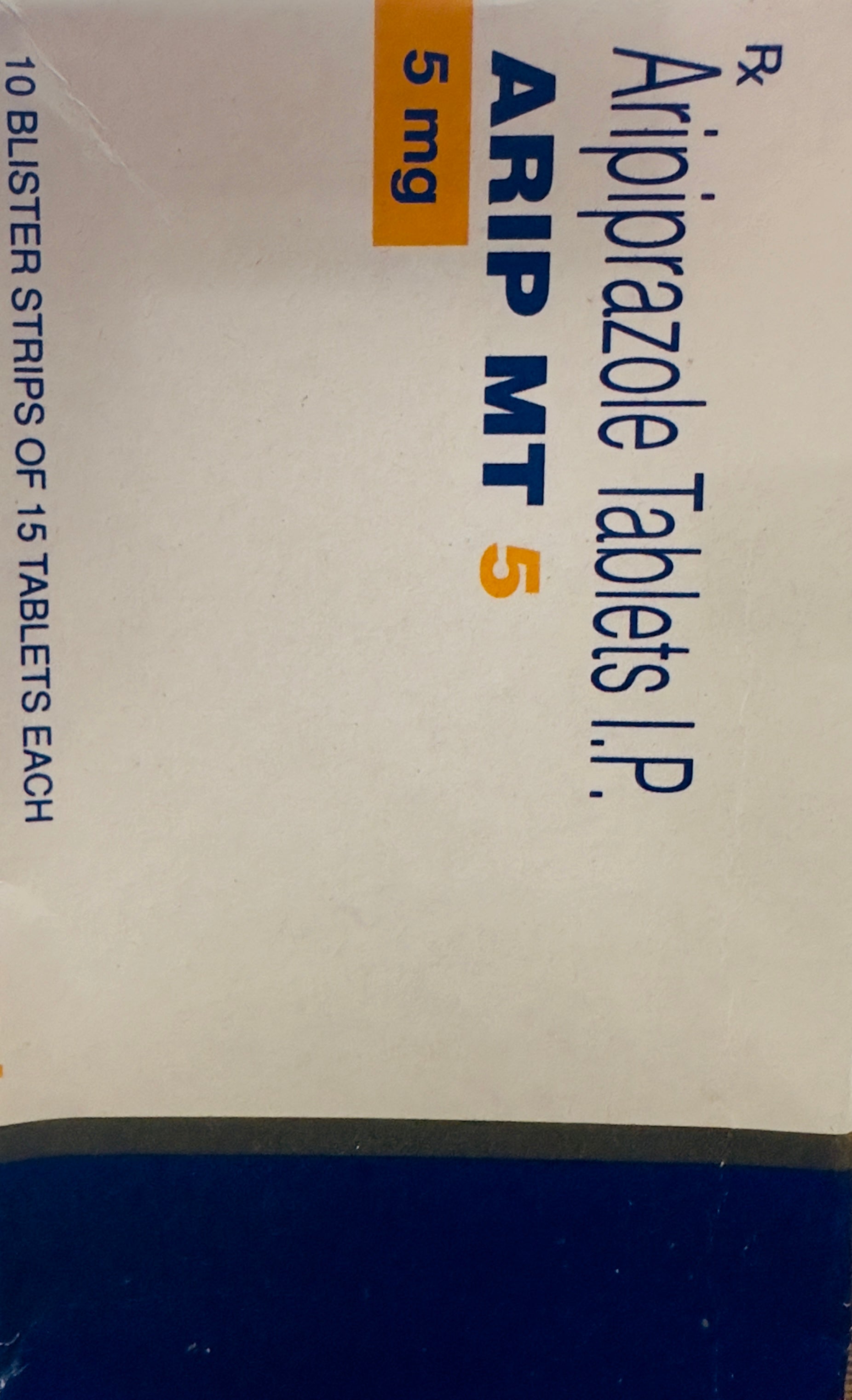 Arip MT 5 टैबलेट द्वारा विपणन: - टोरेंट फार्मास्युटिकल्स लिमिटेड का पैक: - 1 स्ट्रिप में 15 टैबलेट नमक का नाम: - अरिपिप्राज़ोल (5mg) प्रिस्क्रिप्शन आवश्यक: - हाँ उपयोग: - सिज़ोफ्रेनिया उन्माद वैकल्पिक ब्रांड: - एरोल 5mg टैबलेट, अर्पिडॉन 5mg टैबलेट, एरिप 5mg टैबलेट, अरिपिरेन 5mg टैबलेट, लोयज़ोल 5mg टैबलेट, निर्माता/विपणक का पता बंद। आश्रम रोड, अहमदाबाद - 380 009., गुजरात, भारत, मूल देश: भारत