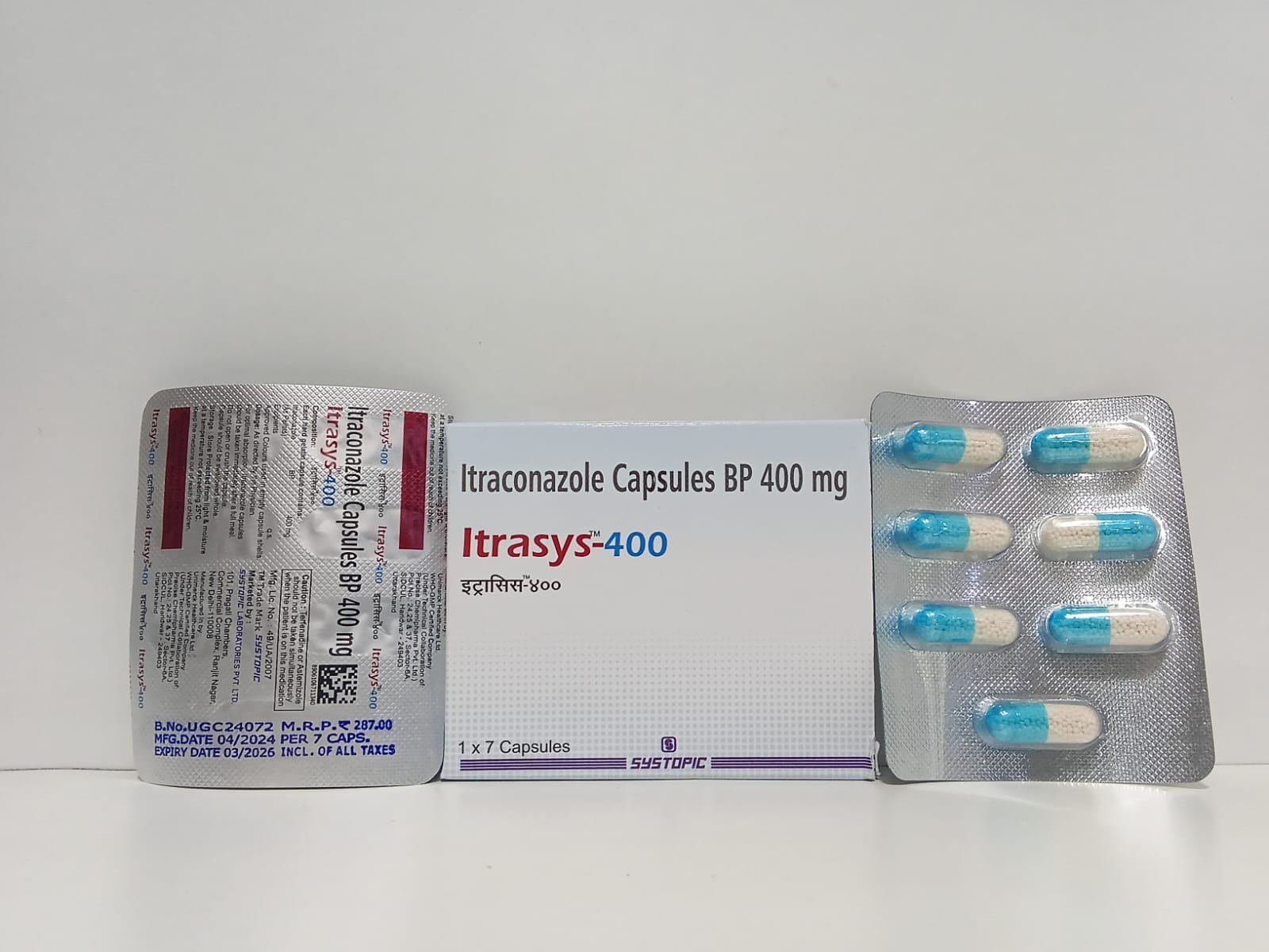 Itrasys 400 कैप्सूल नमक नाम:- इट्राकोनाजोल (400mg) का पैक:- 1 स्ट्रिप में 7 कैप्सूल प्रिस्क्रिप्शन आवश्यक:- हां उपयोग:- फंगल संक्रमण ,-निर्माता/विपणक का पता:-सिस्टोपिक लेबोरेटरीज प्राइवेट लिमिटेड सिस्टोपिक लेबोरेटरीज प्राइवेट. लिमिटेड, 101, प्रगति चेम्बर्स, कमर्शियल कॉम्प्लेक्स, रंजीत नगर, नई दिल्ली-110008