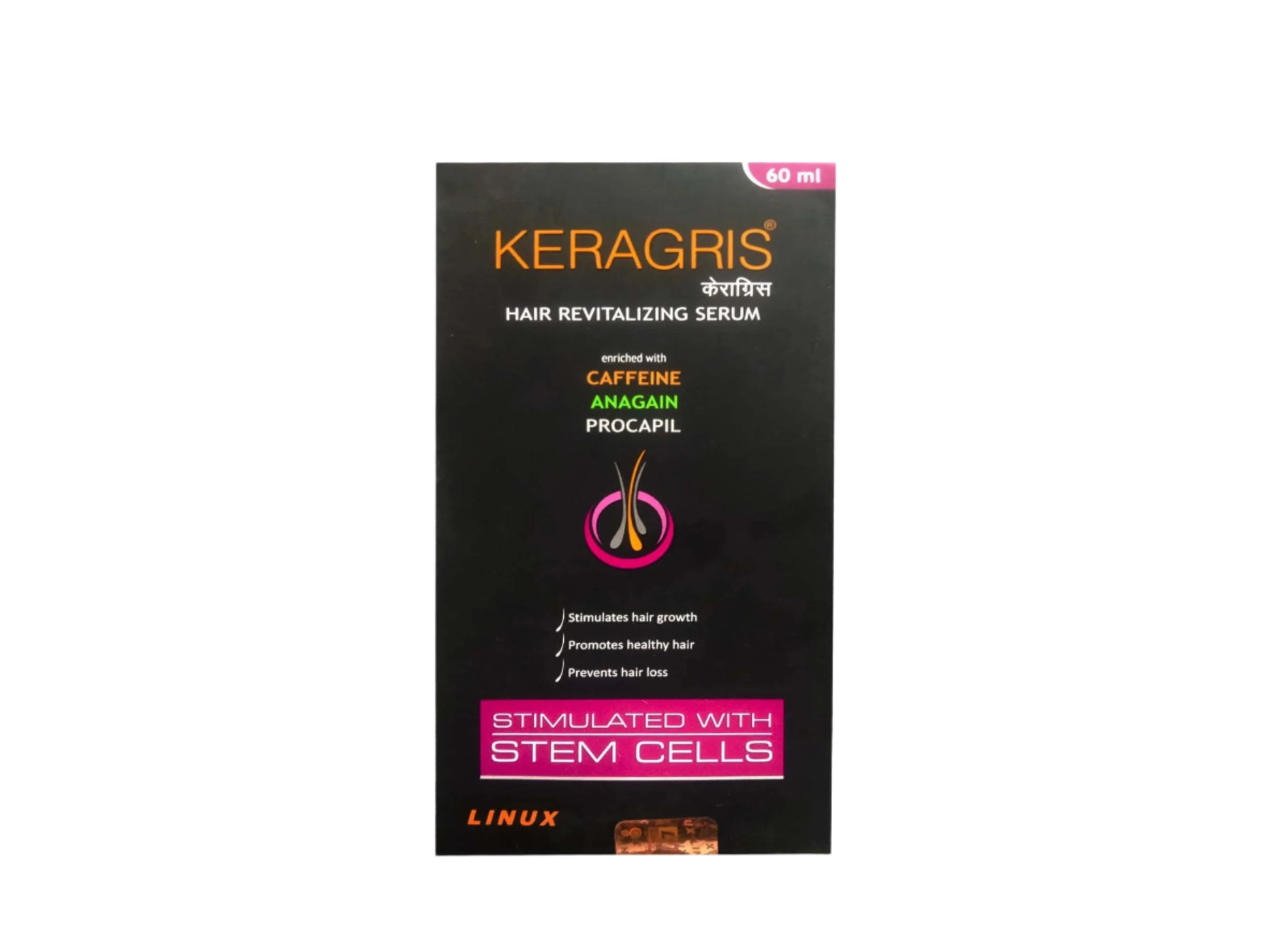 Keragris Hair Revitalizing Serum is an advanced hair care product formulated to nourish hair follicles, reduce hair fall, and promote hair growth. Enriched with key ingredients like caffeine, Anagain, and Procapil, this serum stimulates stem cells to enhance hair renewal, maintain volume, and prevent hair loss.