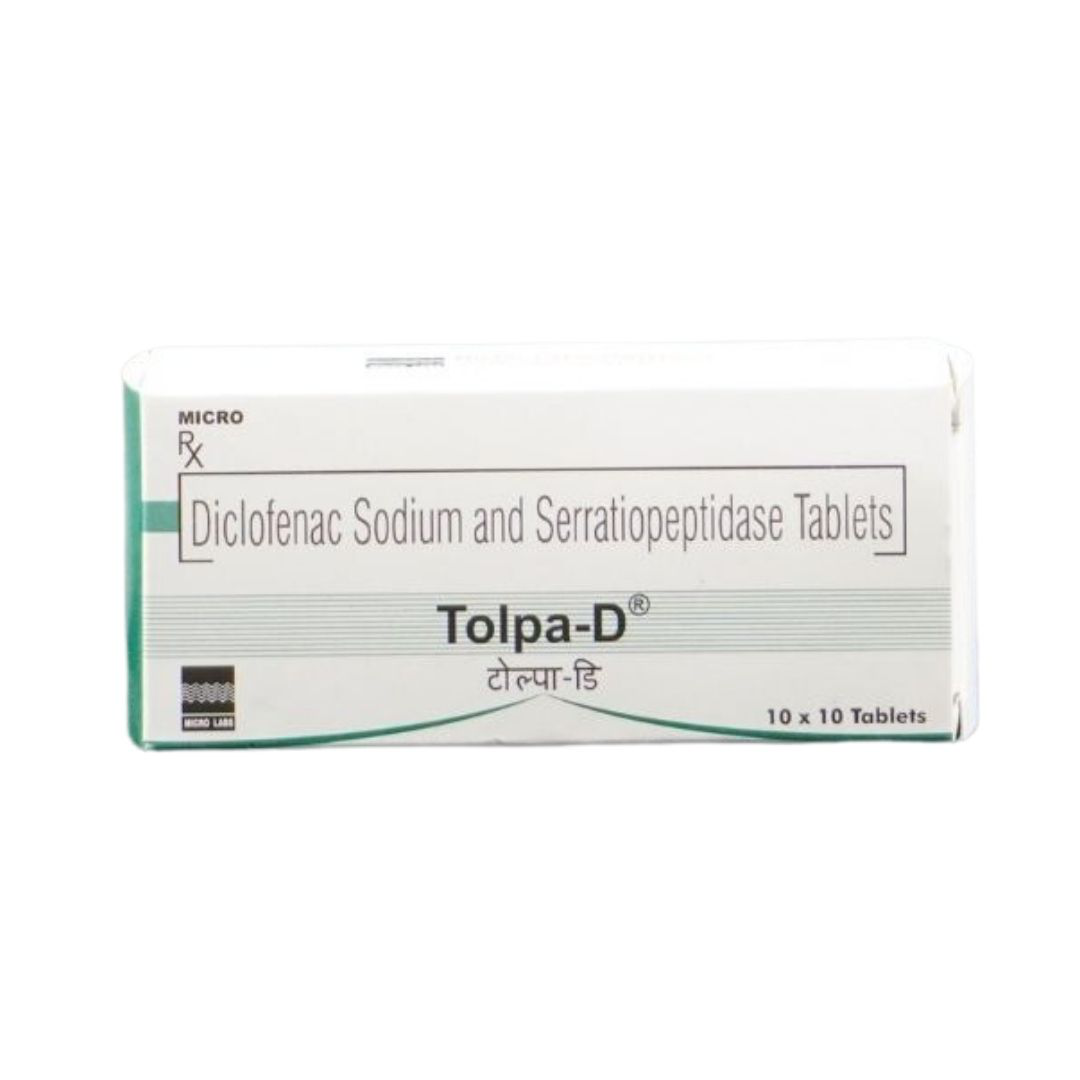 Tolpa-D-Tablet नमक की संरचना:-डाइक्लोफेनाक (50mg) + Serratiopeptidase (10mg) का पैक:-1 स्ट्रिप में 10 टैबलेट का उपयोग:-दर्द से राहत निर्माता/विपणक का पता:-माइक्रो लैब्स लिमिटेड,27, रेस कोर्स रोड, बंगलौर- 560 001, भारत