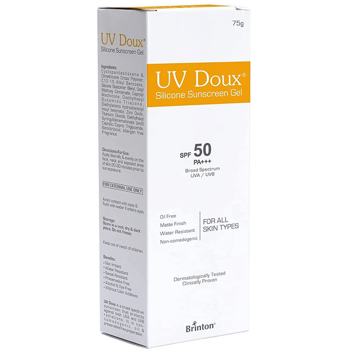 UV Doux Silicone Sunscreen Gel SPF 50 PA+++ is a dermatologically tested and clinically proven formula that contains physical UV blockers (zinc oxide, titanium dioxide) and chemical UV blockers (bemotrizinol) and provides broad spectrum protection against UVA and UVB, thus protecting the skin against damage and tanning. It provides a matte finish inhibits the formation of radicals and helps in sebum control in acne-prone patients. No balling effect on the skin is observed when rubbed